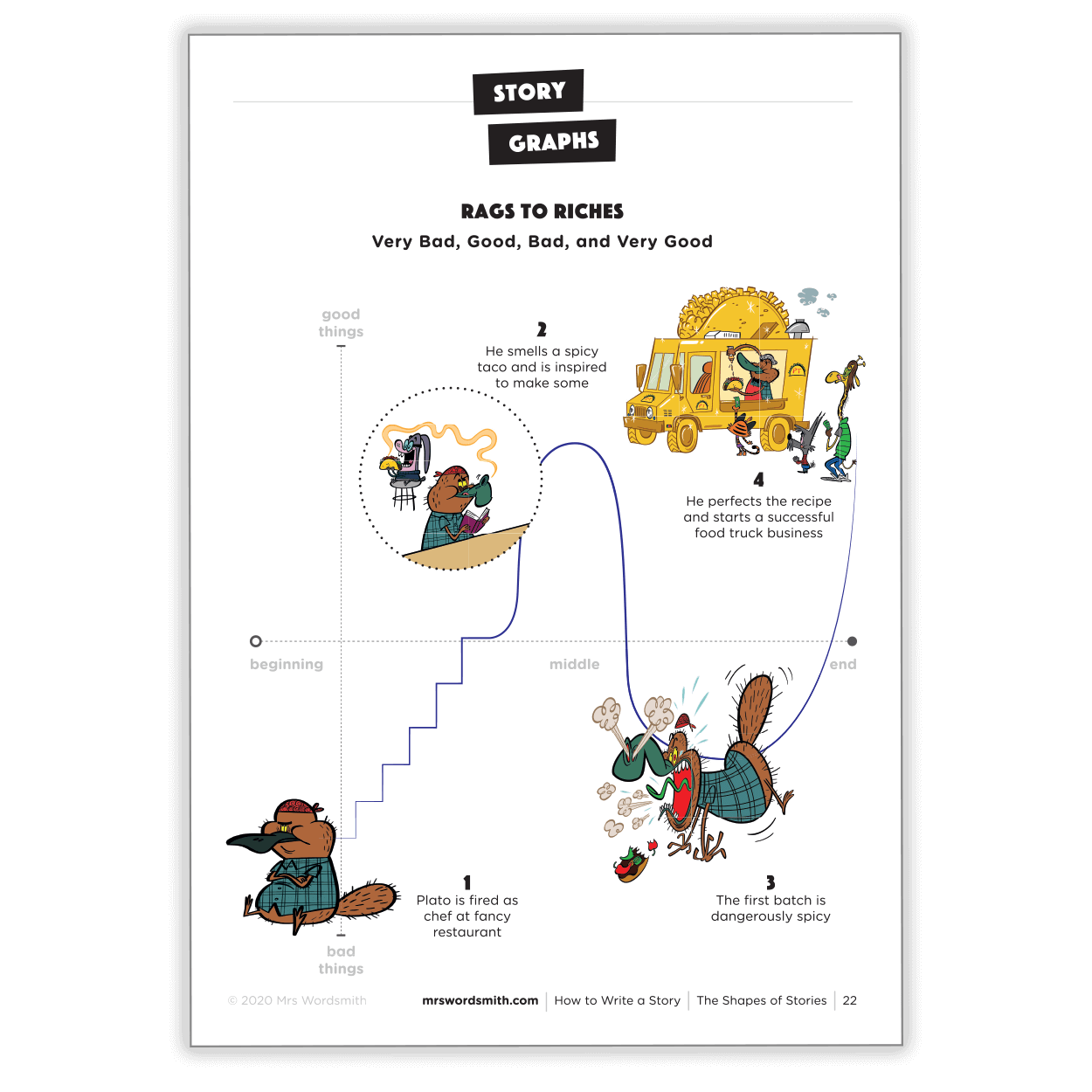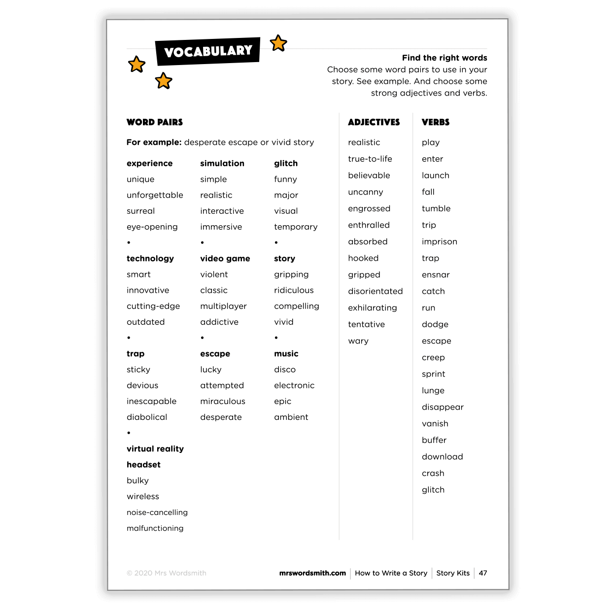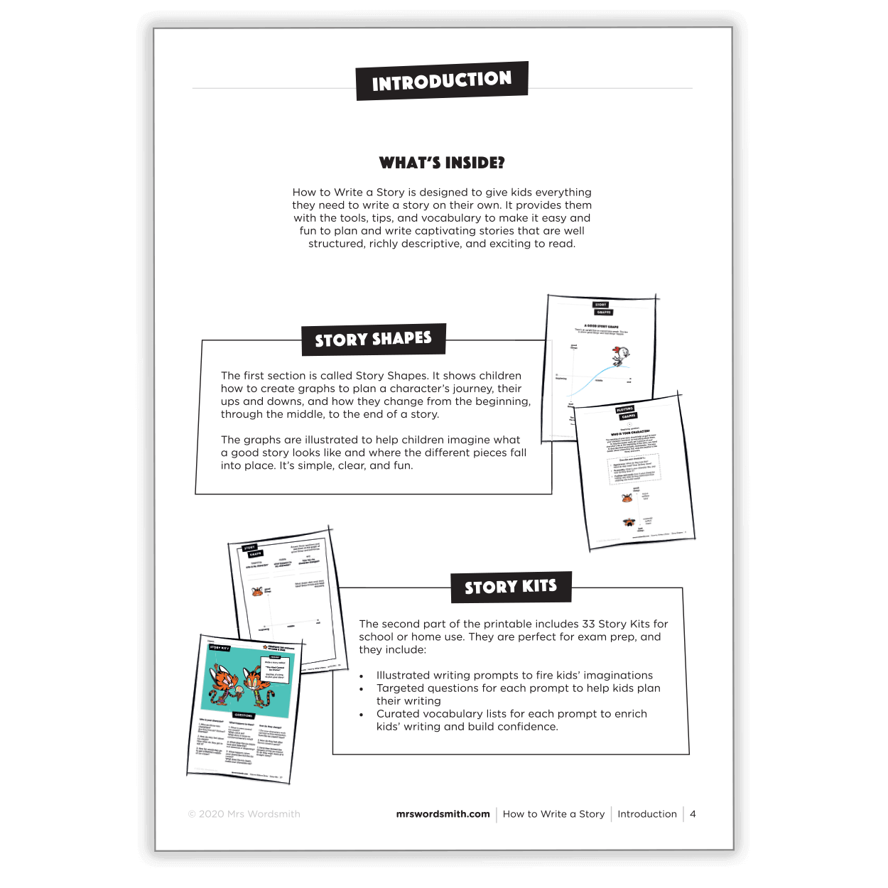 How to Write a Story is the ultimate illustrated guide to creative writing for ages 7-9 (Years 3-4). It's got everything your child needs to know to write captivating stories, with 241 print-at-home pages with easy-to-follow mark schemes and descriptive vocabulary lists. This printable features: Story Graphs - a simple planning framework to help kids structure their stories. Story Kits - writing prompts; covering topics from classical literature to space missions.
